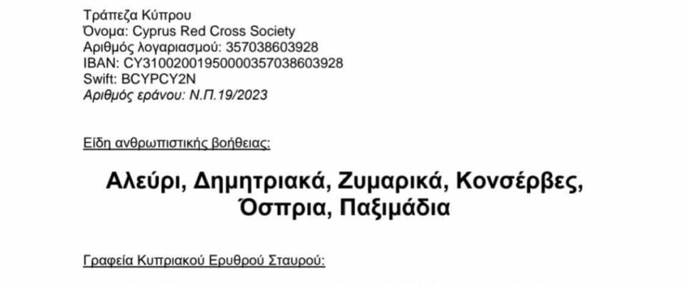 Τα είδη ανθρωπιστικής βοήθειας θα συλλέγονται από την Τετάρτη, 20/9/2023 μέχρι την Πέμπτη, 28/9/2023, (εκτός Σαββατοκυρίακου) από τις 10 π.μ.-1 μ.μ. στους εξής τόπους: