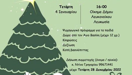 Ο Δήμος Λευκονοίκου και το Προσφυγικό Σωματείο “Το Λευκόνοικο” σας προσκαλούν στην παιδική χριστουγεννιάτικη γιορτή της επαρχίας Λευκωσίας που θα γίνει στο οίκημα του Δήμου μας στις 4 Ιανουαρίου 2023, ημέρα Τετάρτη και ώρα 4:00 μμ. Να κοπιάστε. Δηλώστε την συμμετοχή των παιδιών σας μέχρι 12 χρόνων. Θα δοθούν δώρα από τον Άγιο Βασίλη. Δηλώσεις… Read more »