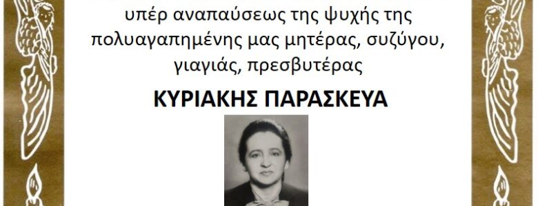 Αύριο το 40ήμερο μνημόσυνο της αγαπημένης μας φιλολόγου, Κυριακής Παρασκευά, που τίμησε το Λευκόνοικό μας! Αιωνία η μνήμη αυτής! Της οφείλουμε πάρα πολλά!