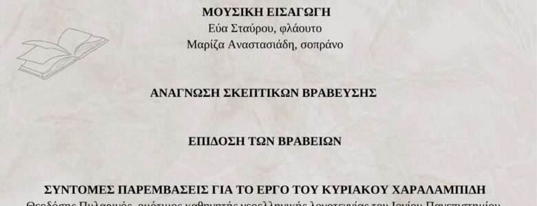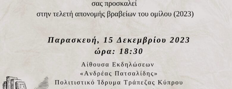 Του Λεωνίδα Γαλάζη Πραγματοποιήθηκε ψες Παρασκευή με εξαιρετική επιτυχία η Τελετή Απονομής Βραβείων του Ομίλου Λογοτεχνίας και Κριτικής στην κατάμεστη Αίθουσα ΑΝΔΡΕΑΣ ΠΑΤΣΑΛΙΔΗΣ του Πολιτιστικού Ιδρύματος Τραπέζης Κύπρου. Σύντομα θα είναι στη διάθεση κάθε ενδιαφερομένου φωτογραφικό υλικό και το βίντεο της εκδήλωσης. Θερμές ευχαριστίες σε όλους όσοι μας τίμησαν με την παρουσία τους. Ιδιαίτερα στη… Read more »