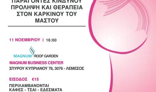 25 ΟΚΤΩΒΡΙΟΥ- Παγκόσμια Ημέρα Κατά του Καρκίνου του Μαστού Ο Οργανισμός μας σας προσκαλεί σε εκδήλωση ενημέρωσης με θέμα <<Παράγοντες Κινδύνου, Πρόληψη και Θεραπεία στον Καρκίνο του Μαστού>> με ομιλήτρια την Δρ. Κωνσταντίνα Στυλιανού. Τα καθαρά έσοδα της εκδήλωσης θα διατεθούν για σχετικό φιλανθρωπικό σκοπό ο οποίος θα ανακοινωθεί κατά την διάρκεια της εκδήλωσης. Ο… Read more »