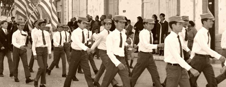 Νεαροί μαθητές έξω από την Καμίντζειο Ανωτέρα Σχολή Λευκονοίκου στα τέλη της δεκαετίας του 1950.