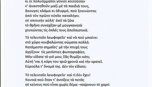 Το παρακάτω ποίημα του ΚΥΡΙΑΚΟΥ ΧΑΡΑΛΑΜΠΙΔΗ, από τη συλλογή “Θόλος”, αναφέρεται στο λεωφορείο που θα έφερνε στον χώρο υποδοχής, στον περίβολο της Ξενοδοχειακής Σχολής, στη Λευκωσία, τους τελευταίους αιχμαλώτους από τις φυλακές της Τουρκίας, τον Δεκέμβριο του 1974. (Από σχόλιο του ποιητή).