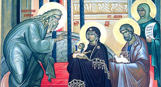 Χαίρε Κεχαριτωμένη Θεοτόκε Παρθένε, εκ σου γαρ ανέτειλεν ο Ήλιος της δικαιοσύνης, Χριστός ο Θεός ημών, φωτίζων τους εν σκότει. Ευφραίνου και συ Πρεσβύτα δίκαιε, δεξάμενος εν αγκάλαις τον ελευθερωτήν των ψυχών ημών, χαριζόμενον ημίν και την Ανάστασιν.