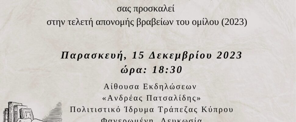 Πραγματοποιήθηκε ψες Παρασκευή με εξαιρετική επιτυχία η Τελετή Απονομής Βραβείων του Ομίλου Λογοτεχνίας και Κριτικής στην κατάμεστη Αίθουσα ΑΝΔΡΕΑΣ ΠΑΤΣΑΛΙΔΗΣ του Πολιτιστικού Ιδρύματος Τραπέζης Κύπρου. Σύντομα θα είναι στη διάθεση κάθε ενδιαφερομένου φωτογραφικό υλικό και το βίντεο της εκδήλωσης.