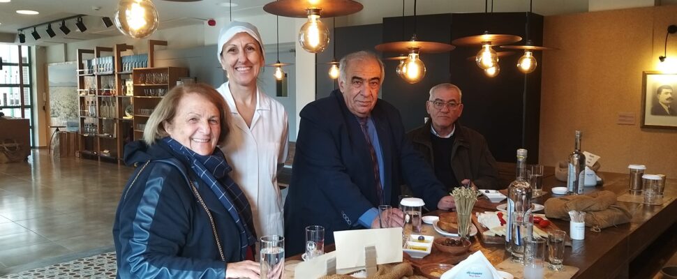 Μας υποδέχθηκε και μας ξενάγησε στις εγκαταστάσεις του εργοστασίου και στο Μουσείο η Γενική Διευθύντρια, η οποία μαζί με μια συνεργάτιδά της μάς εξέπληξαν ευχάριστα με τη φιλοξενία τους. Ήπιαμε ουζάκι μαζί με τον μεζέ του: νέκταρ και αμβροσία μάς φάνηκαν: ελιές ντόπιες, λαδοτύρι του νησιού, ντοματίνια, λάδι φρέσκο και παξιμάδι.