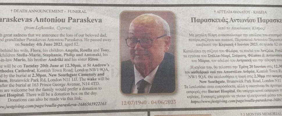 Η κηδεία του γείτονά μας, Παρασκευά (Παρασκή) Αντωνίου, γιου του λαϊκού μας ποιητή, μ. Αντώνη Αντωνίου, θα γίνει την Τρίτη, 20 Ιουνίου 2023, στις 12:30 μ.μ., από τον Καθεδρικό Ναό του Αποστόλου Ανδρέα στο Λονδίνο.
