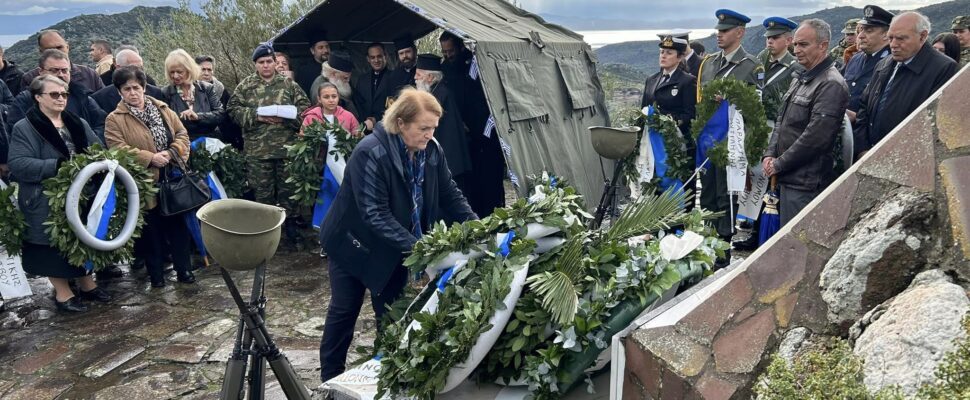 Μετά την Επίσημη Δοξολογία στο Μητροπολιτικό ναό «Αγίου Ιωάννου» στην Καλλονή, ακολούθησε η Άνοδος στο λόφο του «Τυρανιδίου» στη στήλη πεσόντων όπου και εψάλη Τρισάγιο χοροστατούντων του Μητροπολίτη Μυτιλήνης κ.κ. Ιακώβου και Μηθύμνης κ.κ. Χρυσοστόμου, το Προσκλητήριο πεσόντων και η τελετή κατάθεσης στεφάνων από τις αρχές.