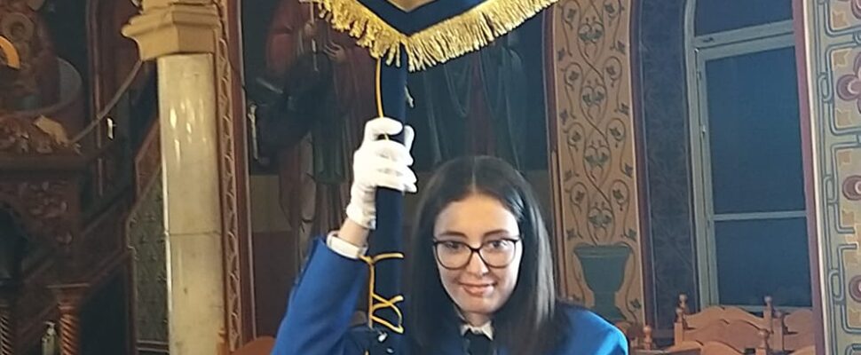 Η μαθήτρια του Λυκείου Παραλιμνίου, Εύη Κωνσταντίνου, ένα πολύ γλυκό κορίτσι, κρατά το λάβαρο του Δήμου Λευκονοίκου στην εκκλησία του Αγίου Γεωργίου στο Παραλίμνι.