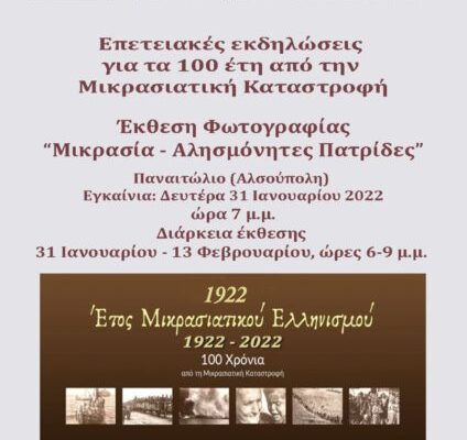 Στο πλαίσιο των επετειακών εκδηλώσεων μνήμης για τα 100 έτη από την Μικρασιατική καταστροφή, τη Δευτέρα 31 Ιανουαρίου 2022 και ώρα 7:00μμ στον χώρο του Παναιτωλίου (Πλατεία Παναιτωλίου, Αλσούπολη) θα πραγματοποιηθούν τα ματαιωθέντα εγκαίνια της έκθεσης φωτογραφίας με τίτλο: «ΜΙΚΡΑΣΙΑ-ΑΛΗΣΜΟΝΗΤΕΣ ΠΑΤΡΙΔΕΣ».
