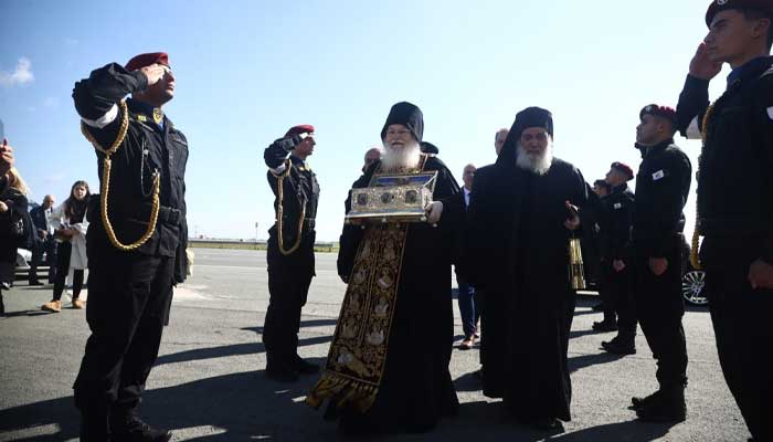 Στο αεροδρόμιο της Λάρνακας Ιεράρχες της Εκκλησίας της Κύπρου και απλός κόσμος καλωσορίζει το ιερό κειμήλιο με προσμονή και με ξέχειλη χαρά σε αυτό το αντάμωμα που έγραψε καινούρια σελίδα στην ιστορία της Κύπρου.