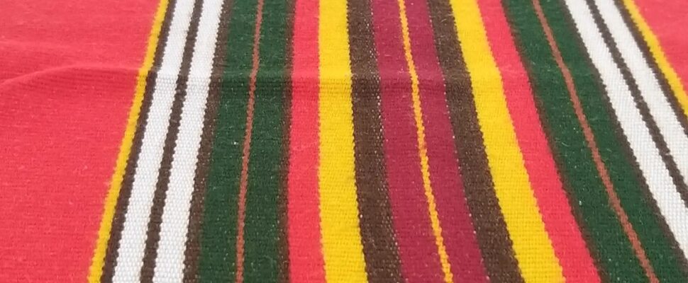 Ένα υφαντό μας, πολύχρωμο λευκονοικιάτικο σεμέν, το οποίο γύρισε από την Αγγλία, όπου είχε πάει ως προίκα..