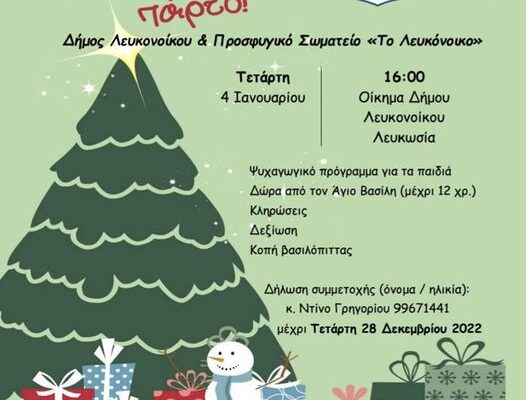 Ο Δήμος Λευκονοίκου και το Προσφυγικό Σωματείο “Το Λευκόνοικο” σας προσκαλούν στην παιδική χριστουγεννιάτικη γιορτή της επαρχίας Λευκωσίας που θα γίνει στο οίκημα του Δήμου μας στις 4 Ιανουαρίου 2023, ημέρα Τετάρτη και ώρα 4:00 μμ.