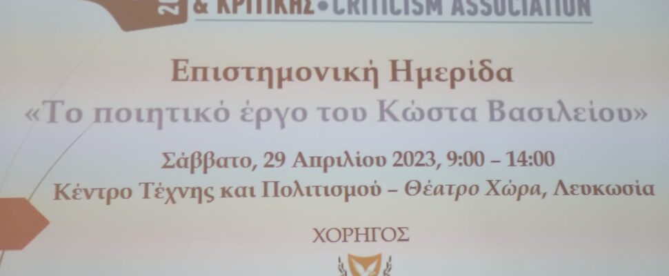 Ο ΟΛΚ ( Όμιλος Λογοτεχνίας και Κριτικής) διοργανώνει σήμερα Συνέδριο για τον φιλόλογο Ποιητή Κώστα Βασιλείου. Προσωπικά, τον αγαπώ και τον ευγνωμονώ τον Κώστα Βασιλείου, γιατί τον είχα Βοηθό Διευθυντή στο Λύκειο Αποστόλου Βαρνάβα, και έμαθα πολλά από αυτόν τον πνευματικό άνθρωπο.