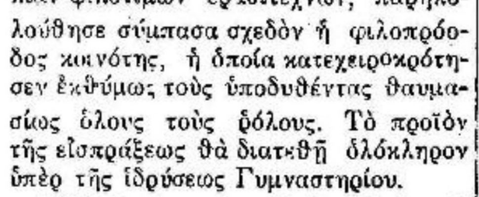 Ο διδάσκαλος Νικηφόρος Θεοχαρίδης αναφέρει η ανταπόκριση μίλησε για το έργο και αναφέρθηκε στον σκοπό της παράστασης οι εισπράξεις από την οποία θα διετίθοντο αποκλειστικά για την ίδρυση Γυμναστηρίου.